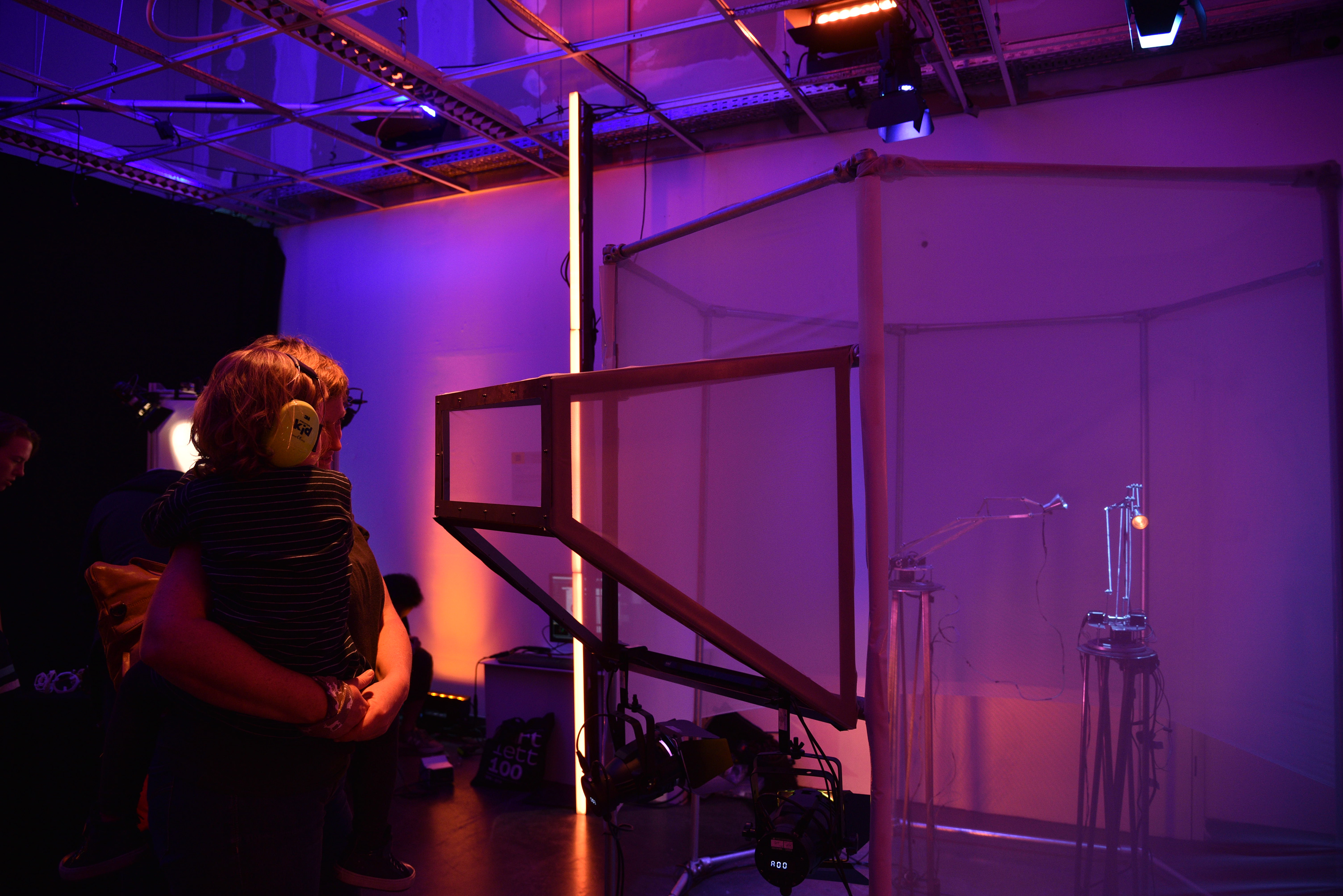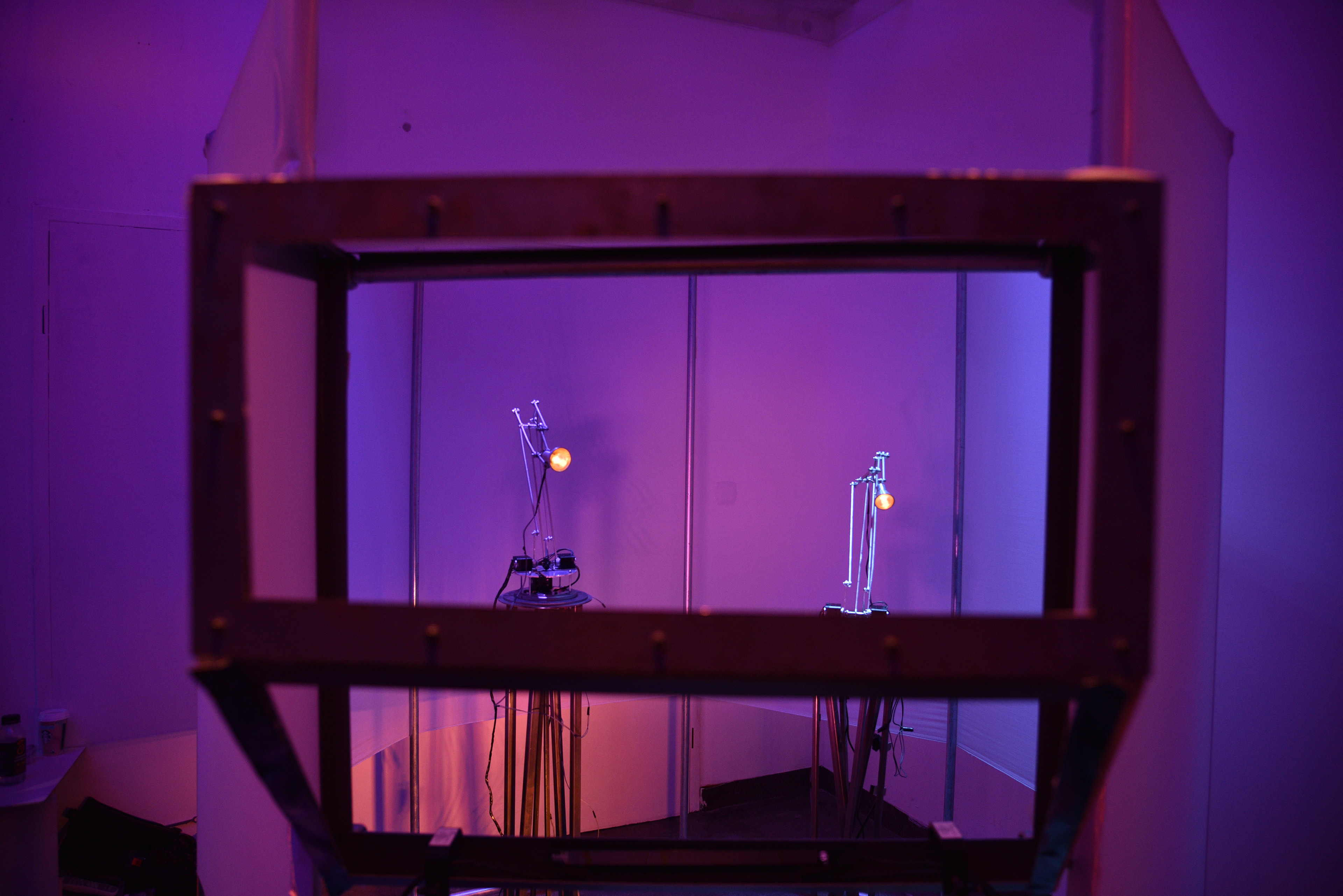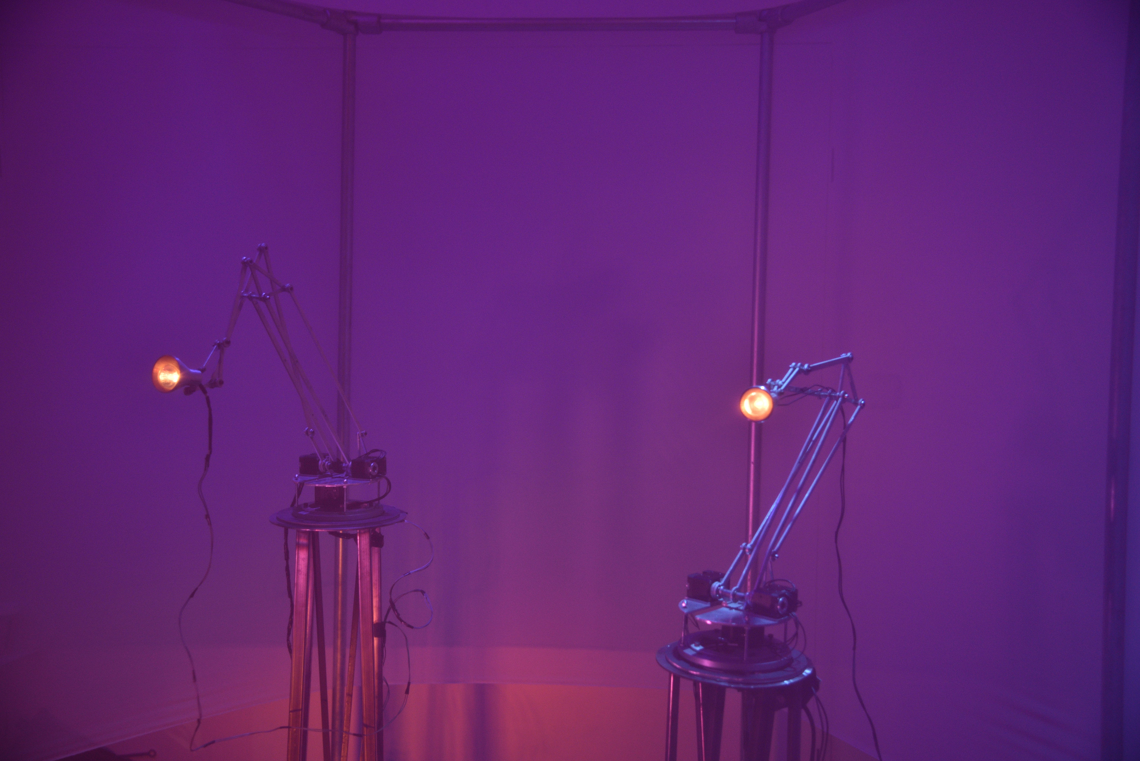 The Entangled Eye features Luna and Laika, two scaled-up robotic lamps with curious and animate behaviours programmed to elicit your attention. As the whimsical creatures chase for your eyes with unique kinematic expressions, the direction of your gaze. orchestrates a conversation, creating a complex system of entanglement within a wondrous environment. The indeterminacy of attention, coupled with the animacy of kinetic movement, constitutes the basis of our attempt at reconfiguring and understanding the perceptual experience of behavioural artefacts. This then shapes how we performatively construct meaning. While learning from one’s eye behaviour in the environment, the installation aims to expose the subjectivity of vision and perception, finding its constitution in the human as much as the machinic.