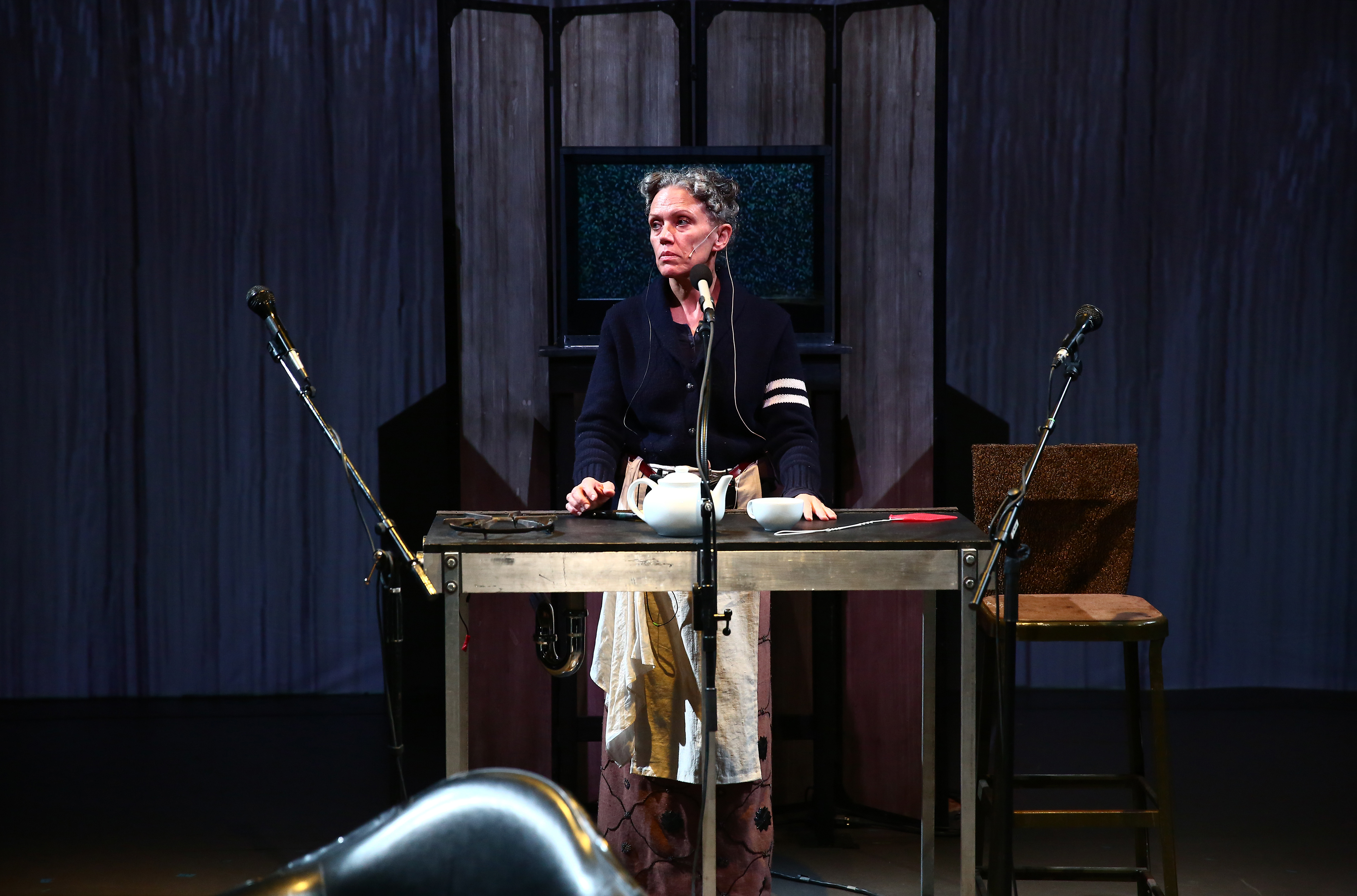 The Wooster Group THE ROOM By Harold Pinter with Ari Fliakos, Philip Moore, Scott Renderer, Suzzy Roche and Kate Valk Director: Elizabeth LeCompte Lighting: Jennifer Tipton with Ryan Seelig Sound: Max Bernstein, Eric Sluyter Original Music Tracks: Omar Zubair Sound Consultant and Additional Sound Elements: Bobby McElver Video and Projections: Robert Wuss, Max Bernstein Costumes: Enver Chakartash Assistant Director: Enver Chakartash Stage Manager: Erin Mullin Production Manager: Bona Lee Technical Fellow/Sound Assistant: Gareth Hobbs Production History 2015 October 28-November 21: The Performing Garage 2016 February 4-14: REDCAT, Los Angeles, California Photo @ Paula Court. Courtesy of The Wooster Group.